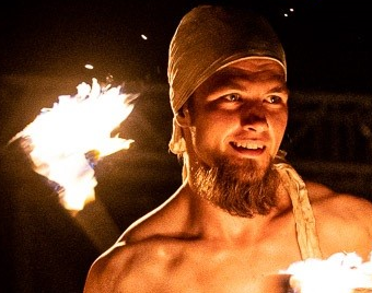 Olek - der wahrscheinlich Verrückteste in der Runde. Als Stabspieler lässt es wilde Flammen so schnell durch die Nacht tanzen, dass das Auge kaum hinterher zu kommen vermag. Aber weil zwei Flammen ihm nicht genug sind, tanzt er besonders gerne mit seinem Dragonstaff - ein Stab, an dem bis zu 10 Fackeln gezündet werden können.